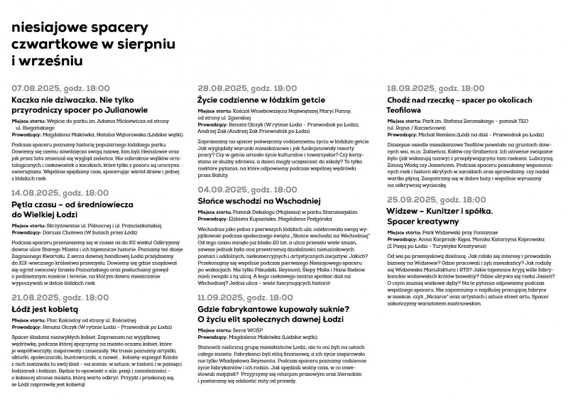 Kontynuujemy nasz cykl Niesiajowych spacerów. Przed nami kolejnych osiem spacerów. Będą spacery po obszarach dalekich od centrum - jak Julianów, Widzew, czy Teofilów. Będzie też spacer szlakiem łodzianek, czy ulicy Wschodniej i jej artystów. Będzie też można przenieść się w czasie i posłuchać o tym, jak funkcjonowały elity dawnej Łodzi.