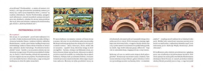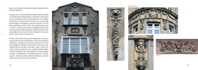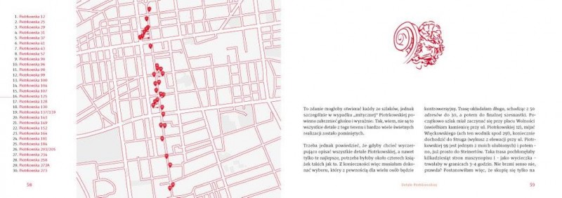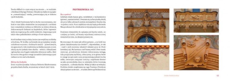 Książka jest pierwszym nie tylko w Łodzi, ale w całym kraju przewodnikiem po detalach architektonicznych. Maria Nowakowska, autorka, zaprasza czytelników na 8 niezwykłych spacerów – dedykowanych łódzkim zwierzętom, roślinom i postaciom. Oczywiście wszystkie znajdują się na elewacjach łódzkich kamienic i pałaców.