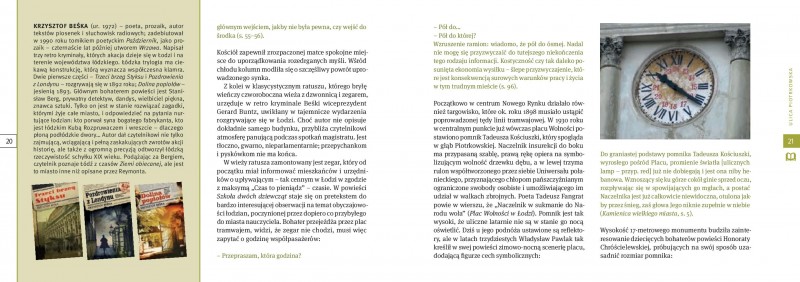 Książka uświadamia beletrystyczne bogactwo Łodzi, ale też zawiera wiele podanych w lekkim stylu ciekawostek. Jej czytelnicy dowiedzą się, kim był wampir Bałut, kto porównał rzeźby na pałacu Poznańskich do strachów na wróble, co myśli Julian Tuwim, siedząc na ławeczce, gdzie w Łodzi można spotkać nocą nagą piękność wędrującą po dachu oraz która ulica w mieście jest najbardziej kryminogenna.