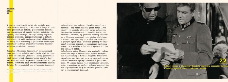 Kolejna po „Przewodniku po filmowej Łodzi” książka w naszym dorobku związana z tematem filmowym. Tym razem będzie również o Łodzi, ale nie tylko – w książce opisane zostaną wszystkie miejscowości, w których realizowane były zdjęcia do serialu. Nad tekstami poświęconymi poszczególnym miastom pracowało siedmioro autorów: Rafał Baćmaga (Płock i Łąck), Bogdan Bernacki (Wrocław, Olsztyn), Arkadiusz Bilecki (Gdańsk, Gdynia, Sopot), Leszek Goławski (Kraków i Pieskowa Skała), Maciej Kronenberg (Łódź), Paweł Szczutowski (Warszawa), Joanna Szyborska-Kaszycka (Warszawa), całość prac redakcyjnych koordynował Bogdan Bernacki, autor książki „Stawka większa niż życie. Serial wszech czasów”.